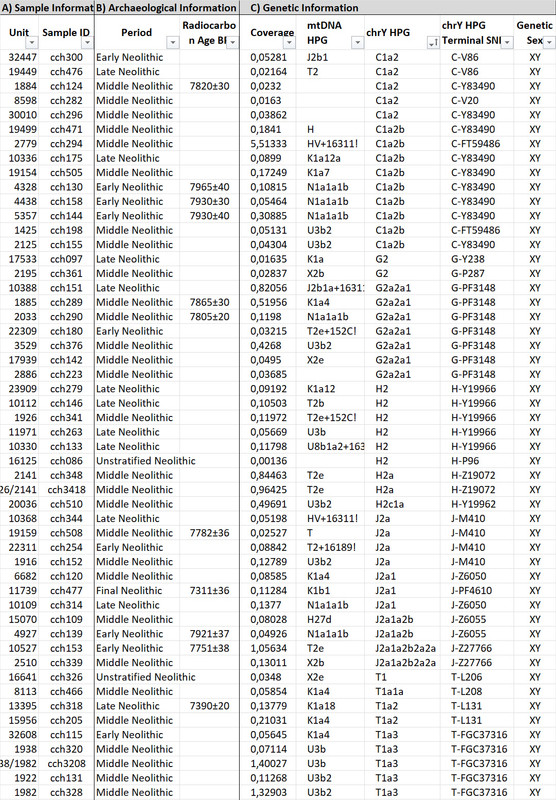 ETM026 - Idlib Governorate T-L454 (T1a) K1a4 3850 Syria - Ebla_EMBAH25 - Tell Halula () K 9400 Syria - Middle PPNB Pre-Pottery Neolithic BH4 - Tell Halula () K 9400 Syria - Middle PPNB Pre-Pottery Neolithic BH7 - Tell Halula () K 9400 Syria - Middle PPNB Pre-Pottery Neolithic BR65-14 - Tell Ramad () K 8925 Syria - PPNBR65-1S - Tell Ramad () K 8925 Syria - PPNB R65-C8-SEB - Tell Ramad () K 8925 Syria - PPNBTQ 28 F250 - Terqa (Tell Ashara), Middle Euphrates Valley () K 4500 Syria ZMOJ - Boncuklu Höyük C-M216 (C) K1a 9900 Turkey - Central_Anatolia_EN (Aceramic)I1102 - Barcın Höyük C-PH428* (C1a) K1a3a 8300 Turkey - Northwest_Anatolia_N (Ceramic)I0746 - Barcın Höyük G-CTS342* (G2a) K1a or K1a1 7928 Turkey - Northwest_Anatolia_N (Ceramic)I0707 - Barcın Höyük () K1a4 8096 Turkey - Northwest_Anatolia_N (Ceramic)I1100 - Barcın Höyük () K1a or K1a6 8300 Turkey - Northwest_Anatolia_N (Ceramic)BAR16 - Barcın, Marmara Region, Northwest Anatolia () K1a1 8109 Turkey - Northwest_Anatolia_N (Ceramic)CCH289 - Çatalhöyük G-PF3148 (G2a) K1a 8845 Turkey - Neolithic (Ceramic)pch034 - Çatalhöyük () K1a17 8715 Turkey - Neolithic (Ceramic)cth728 - Çatalhöyük () K1a 8550 Turkey - Neolithic (Ceramic) cth842 - Çatalhöyük () K1a 8548 Turkey - Neolithic (Ceramic)cth006 - Çatalhöyük () K1a4 8520 Turkey - Neolithic (Ceramic)CBT005 - Çorum Province G-M406 (G2a) K1a 5415 Turkey - Camlibel Tarlasi_LC CBT010 - Çorum Province () K1a 5480 Turkey - CamlibelTarlasi_LCCBT011 - Çorum Province () K1a 5480 Turkey - CamlibelTarlasi_LCCBT017 - Çorum Province () K1a3 5480 Turkey - CamlibelTarlasi_LCI0727 - Mentese G-L140 (G2a) K1a2 7950 Turkey - Mentese Neolithic I0724 - Mentese I-L596 (I2a) K1a4 7950 Turkey - Mentese NeolithicTep001 - Tepecik-Çiftlik Höyük J-M304 (J) K1a 8518 Turkey - Northwest_Anatolia_N (Ceramic)ART019 - Malatya Province J-PF5132 (J2a) K1a3 5393 Turkey - Arslantepe_LCART038 - Malatya Province R-V1636* (R1b) K1a17a 5175 Turkey - Arslantepe_LCALA015 - Hatay Province T-L208 (T1a) K1a 3861 Turkey - Alalakh_MLBA Ash129 - Aşıklı Höyük () K1a4 10093 Turkey - Central_Anatolia_EN (Aceramic)Ash133 - Aşıklı Höyük () K1a4 10093 Turkey - Central_Anatolia_EN (Aceramic) Ash128 - Aşıklı Höyük () K1a4 10040 Turkey - Central_Anatolia_EN (Aceramic)Bon002 - Boncuklu Höyük () K1a 10078 Turkey - Central_Anatolia_EN (Aceramic)AKT16 - Aktopraklık () K1a3 8548 Turkey - Aktopraklık NeolithicTep002 - Tepecik-Çiftlik Höyük () K1a12a 8487 Turkey - Northwest_Anatolia_N (Ceramic)I2499 - Harmanoren-Gondurle Hoyuk, Isparta Province, Western Turkey () K1a 4514 Turkey - Harmanoren-Gondurle_Hoyuk_BA MA2197 - Kalehöyük () K 2900 Turkey - HellenisticSA 2007 AK2 62 - Sagalassos () K1a* 800 Turkey - Mid-Byzantine period SW AnatoliaSA1995 AG90 - Sagalassos () K 800 Turkey - Mid-Byzantine period SW AnatoliaSA1998 LA114-3 - Sagalassos () K1a* 800 Turkey - Mid-Byzantine period SW AnatoliaERS1790730 - Sidon () K1a2 3650 Lebanon - Canaanite cultureI1171 - Peqi'in Cave E-CTS10298 (E1b) K 5950 Israel - Israel ChalcolithicI1172 - Peqi'in Cave T-L208 (T1a) K1a 5950 Israel - Israel Chalcolithic I1155 - Peqi'in Cave T-L208 (T1a) K1a 6150 Israel - Israel Chalcolithic I0867 - Motza H-P96 (H2) K1a4b 8700 Israel - PPNBI4525 - Tel Megiddo J-P58 (J1a) K1a18 3500 Israel - Megido MB III - LB I