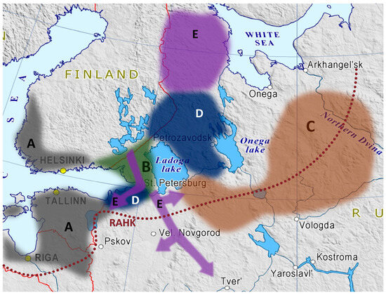 Все в перемежку, нет разделения на ингерманландию и карелию, да и новгородцы там же.